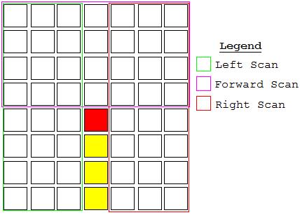 - The Calculus Approach: I thought of this algorithm while working on a Numerical Methods assignment. We could send out a 90 scanners, 30 in each direction. These scanners would have semi-random behavior; they would never run into a wall if they could avoid it but would make all other turning decisions randomly. These scanners would leave walls behind themselves on cloned maps as they moved, and return their path length upon death. Once they have all died, we could take the average of their path lengths and choose to turn in the direction with the highest average. We could increase the number of scanners for a better estimation at the cost of processing time.